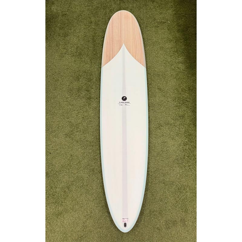 Easy to ride, easy to paddle, and super fun. The TJ Hull Rider is an all-around longboard with incredible stability and a gentle hull bottom. The shape features a teardrop concave cut into the nose for added lift while nose riding and less swing weight through turns. Its flatter entry rocker means paddling power is maximized, letting you glide into waves from way out the back. The board’s rocker provides fast, effortless high line speed down the line combined with the gentle hull bottom, you feel connected and in control of everything. The shape’s downturned rail and hard edge add to the speed and performance, allowing you to roll that hull over onto a hard rail with a smooth gliding feel. The TJ Hull Rider is all about the the sensation the board gives you under your feet, and this board lets you do the type of surfing that just feels good.