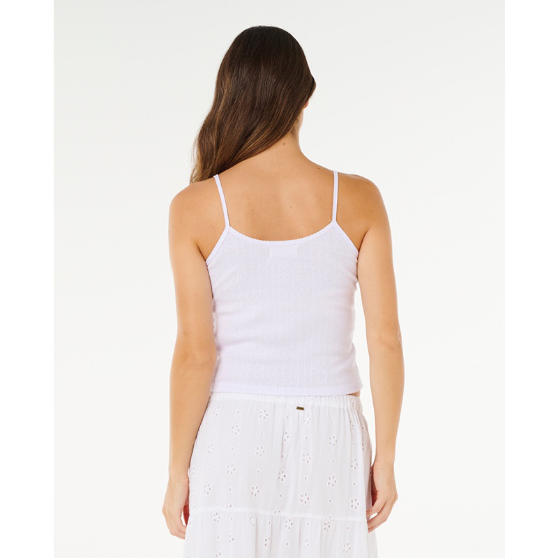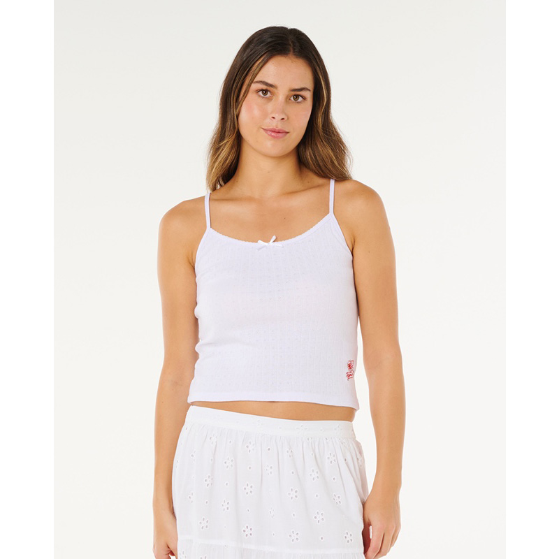 Pointelle cotton and delicate embroidery give the Poolside Tank its breezy vibe, finished with a tank fit and inner neck label for effortless summer days.